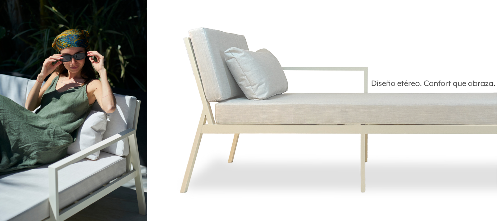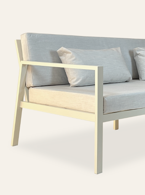 La estructura de aluminio, sólida pero liviana, garantiza máxima resistencia al uso intensivo en exteriores, mientras que sus almohadones transmiten confort absoluto y un aire contemporáneo.