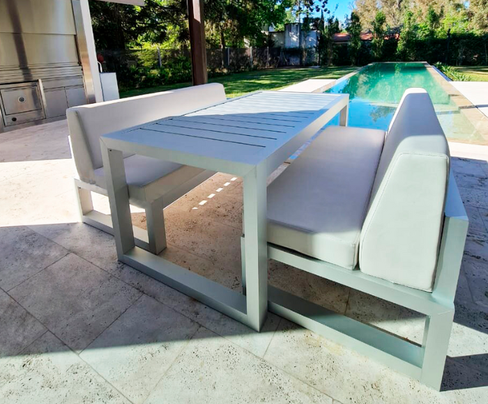 Fabricada enteramente en aluminio con perfiles de 7,5 x 5 cm con acabados de la más alta calidad, es tan resistente a la intemperie como fácil de limpiar. Disponible en una amplia gama de colores que se adaptan a cualquier entorno exterior, da el toque final a los ambientes playeros soñados que caracterizan a esta colección.