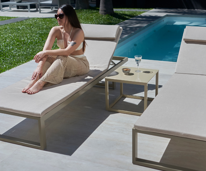 La Mesa Luma Block es una pieza de arrime compacta y liviana, ideal para acompañar sillones y reposeras en espacios exteriores.