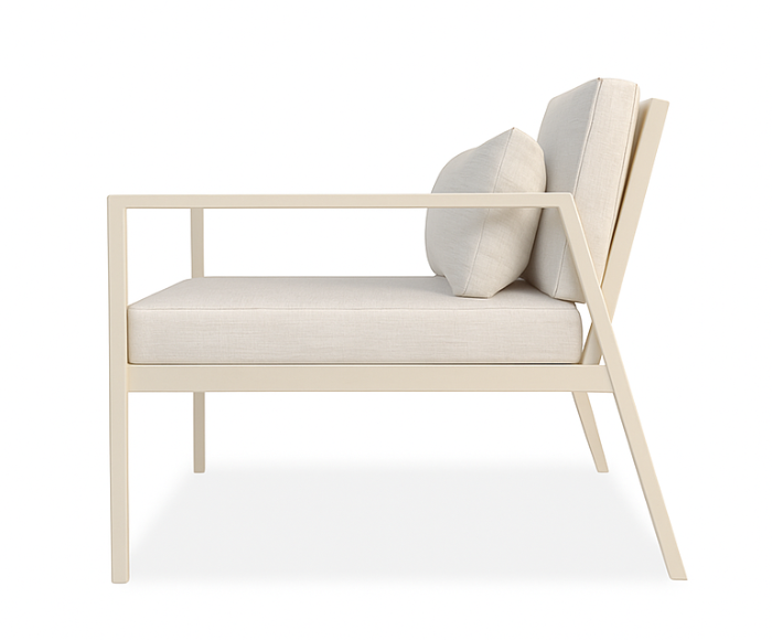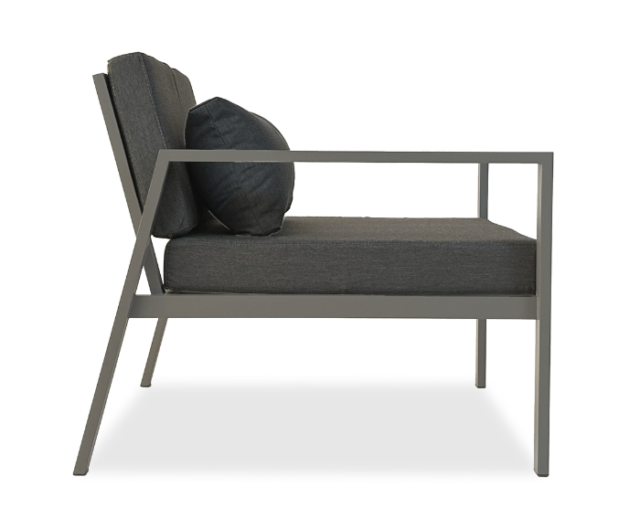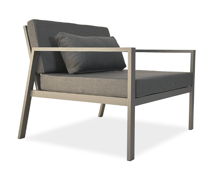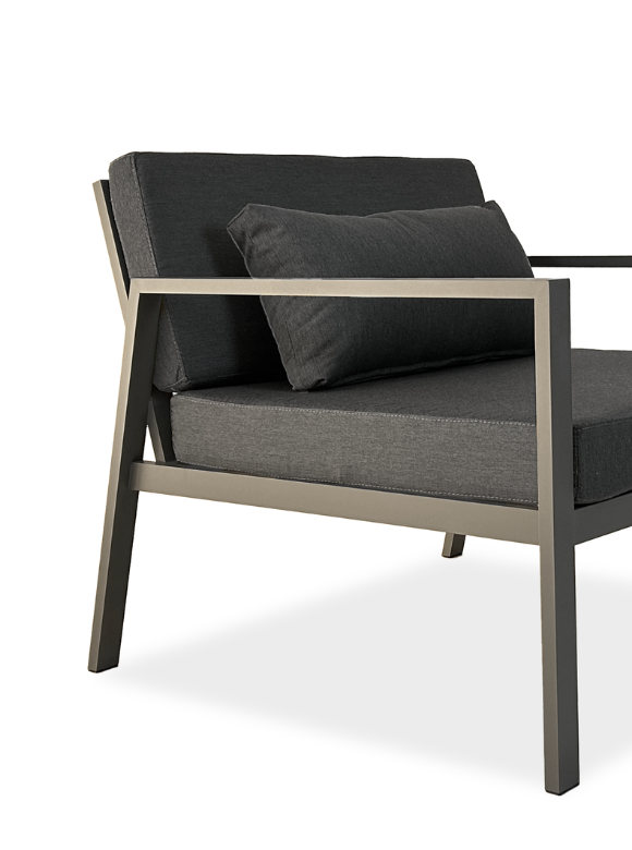 Su estructura de aluminio, liviana pero eterna, ofrece resistencia y durabilidad frente a las exigencias del uso exterior, mientras que el asiento y almohadones de respaldo aseguran una comodidad excepcional.