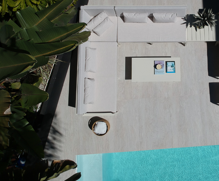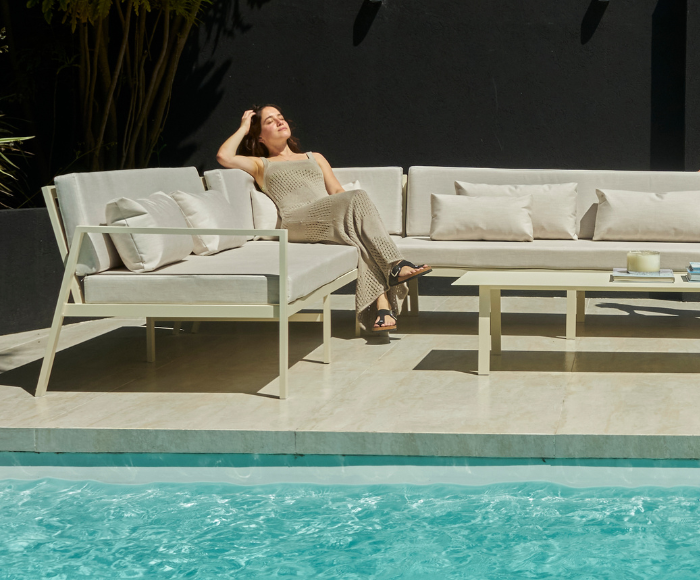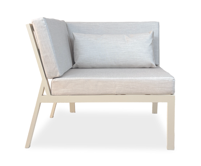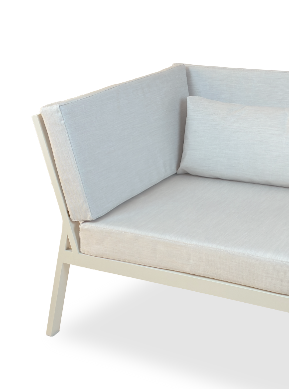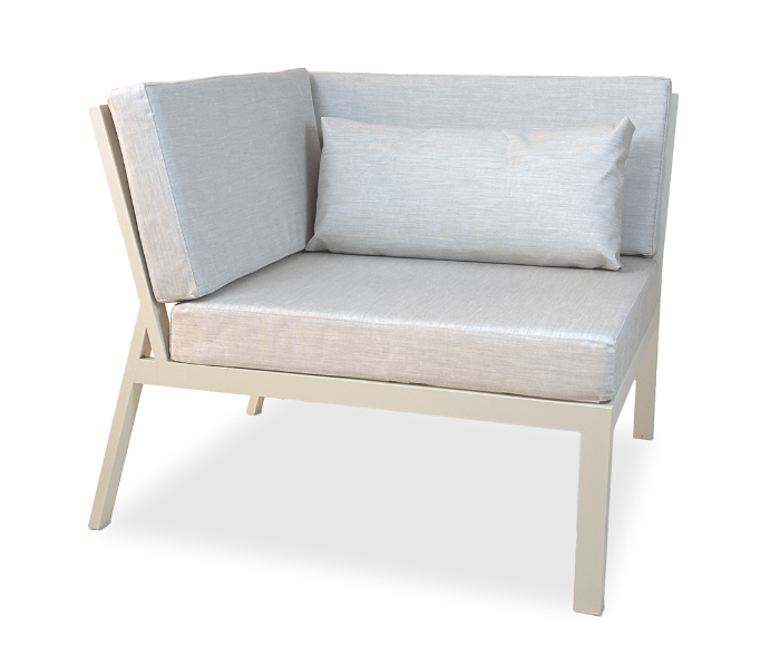 Diseñado para optimizar la modularidad, este esquinero conecta las distintas piezas de la colección, permitiendo crear rincones acogedores y perfectamente integrados en terrazas, galerías o jardines.