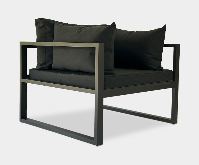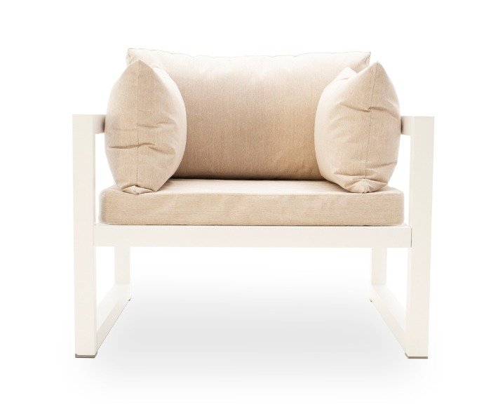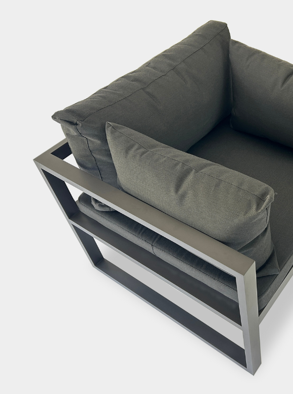 Colección soldada en aluminio con estructura tubular de 5 x 2,5cm, resulta resistente y a la vez duradera. Las formas redondeadas de sus asientos de placa de 8 cm de alto y 30kg/D, sumado a los voluminosos almohadones de respaldos y apoyabrazos, rellenos con fibras de poliéter, le aportan calidez y comodidad. Tapizados en Sunbrella®, Sauleda® o Agora®, disponibles para personalizar con los colores de nuestro catálogo.