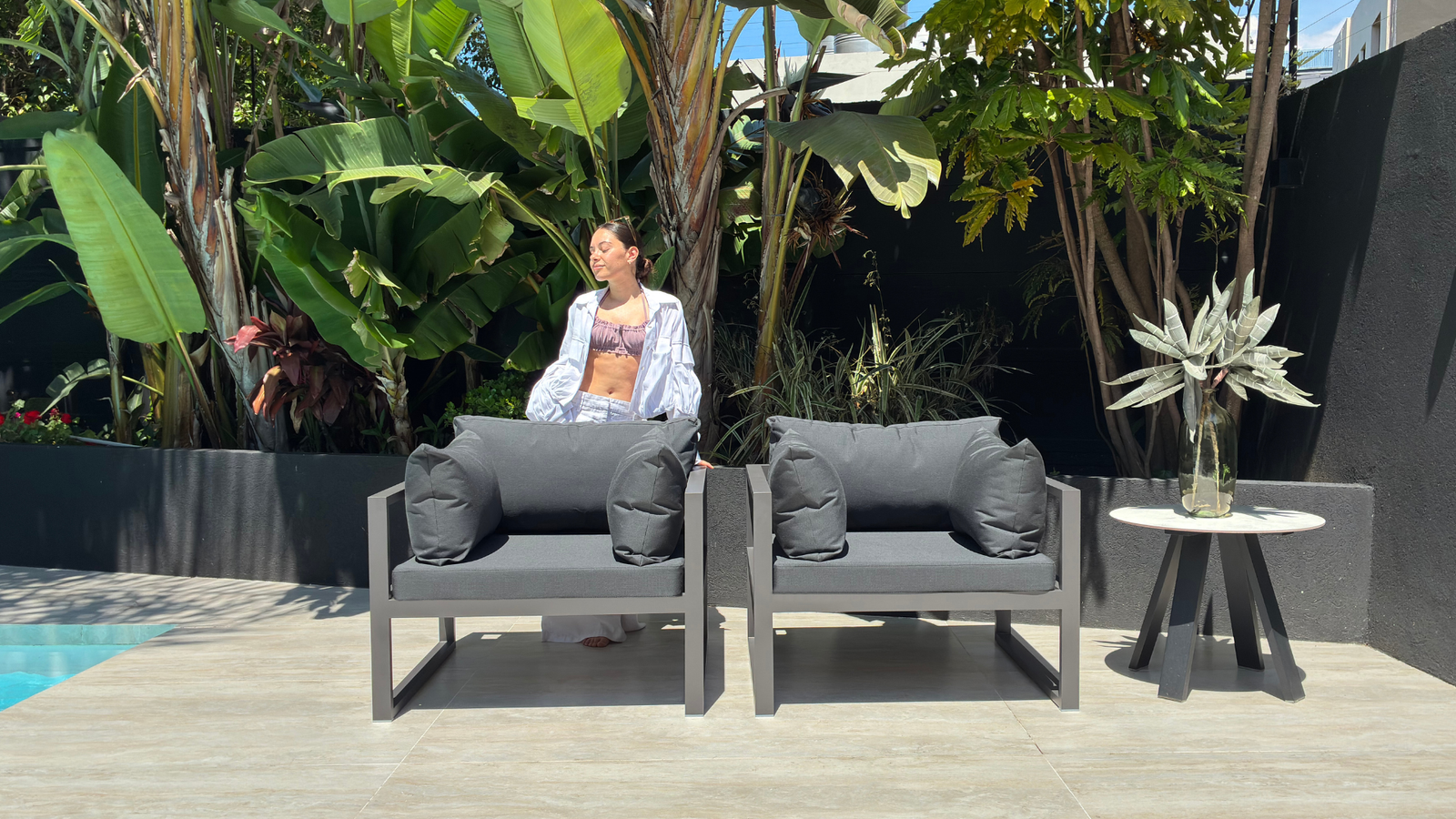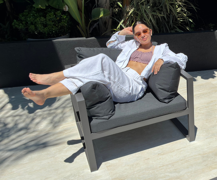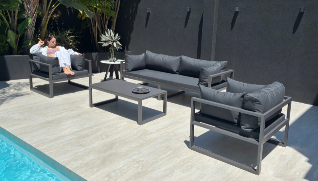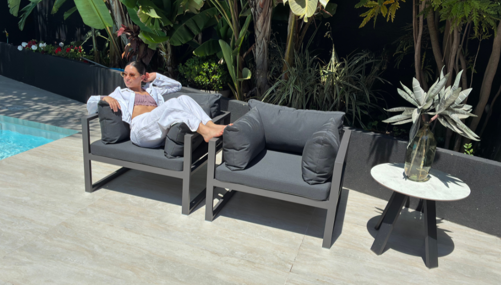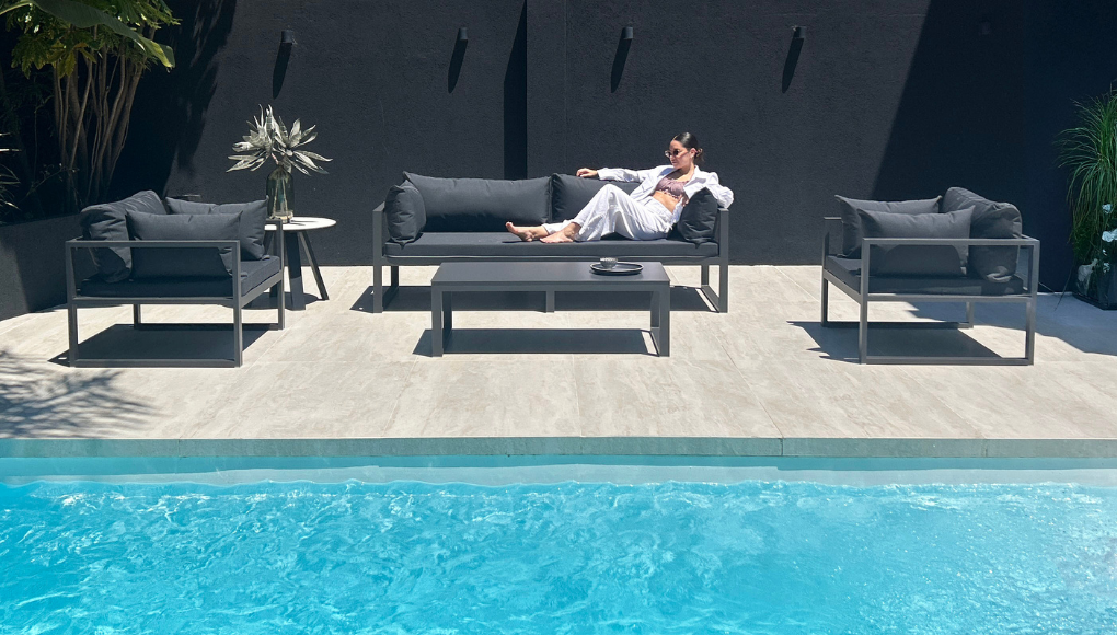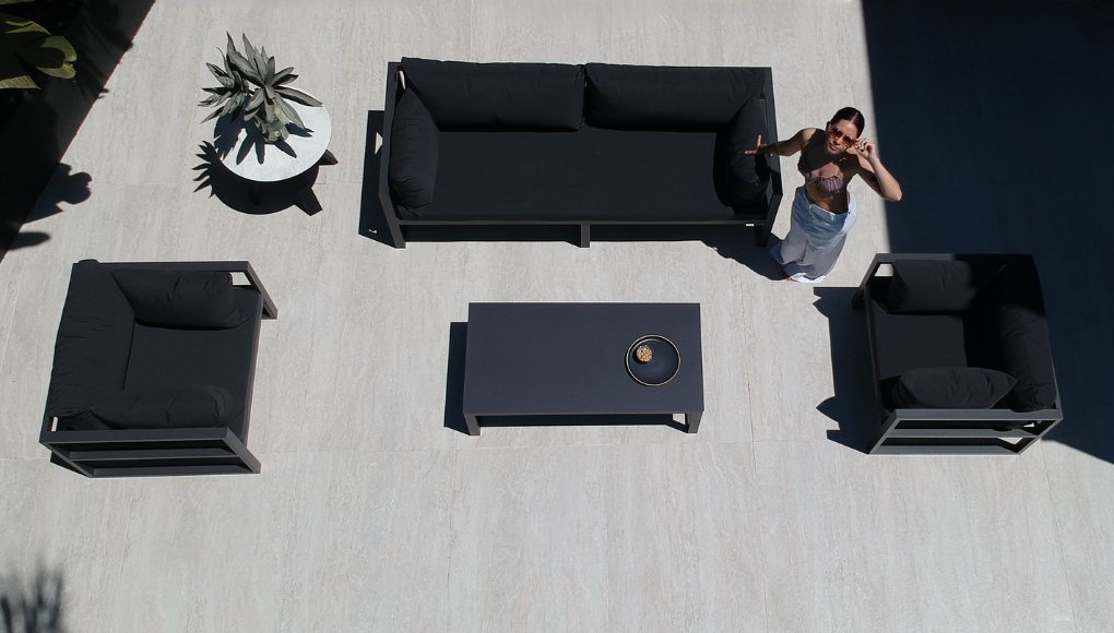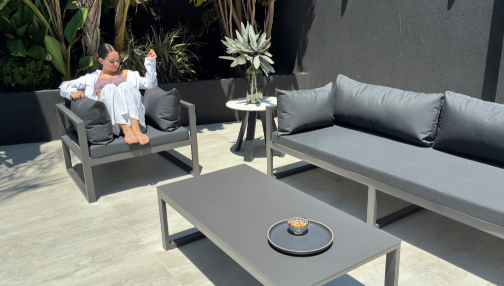 Esta pieza traslada la comodidad y la elegancia de los ambientes interiores al exterior, difuminando la línea entre el hogar y el jardín.