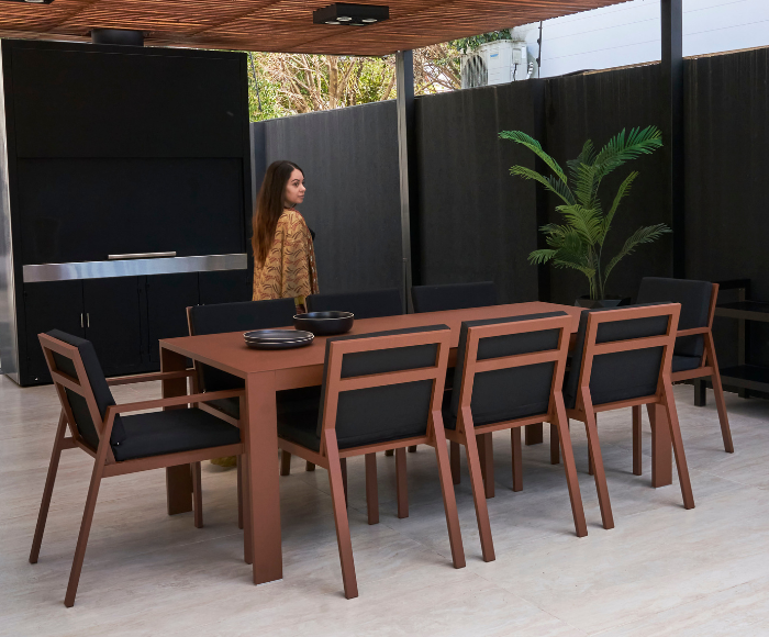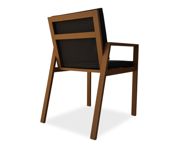 Su estructura de aluminio con perfiles de 4 x 2 cm le otorga firmeza y resistencia al uso intensivo en exteriores, manteniendo a la vez una silueta ligera y elegante. El respaldo levemente inclinado asegura una postura cómoda y relajada, ideal para acompañar largas reuniones al aire libre.