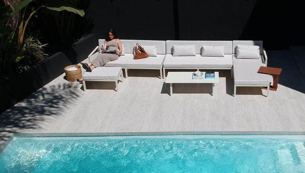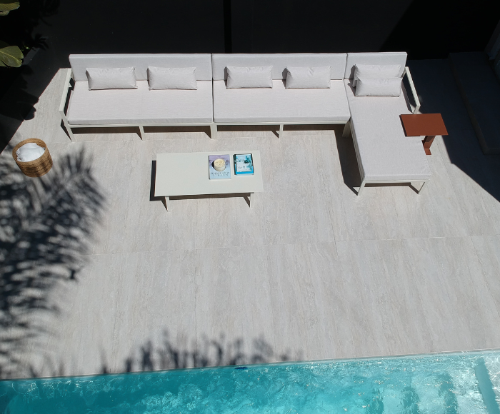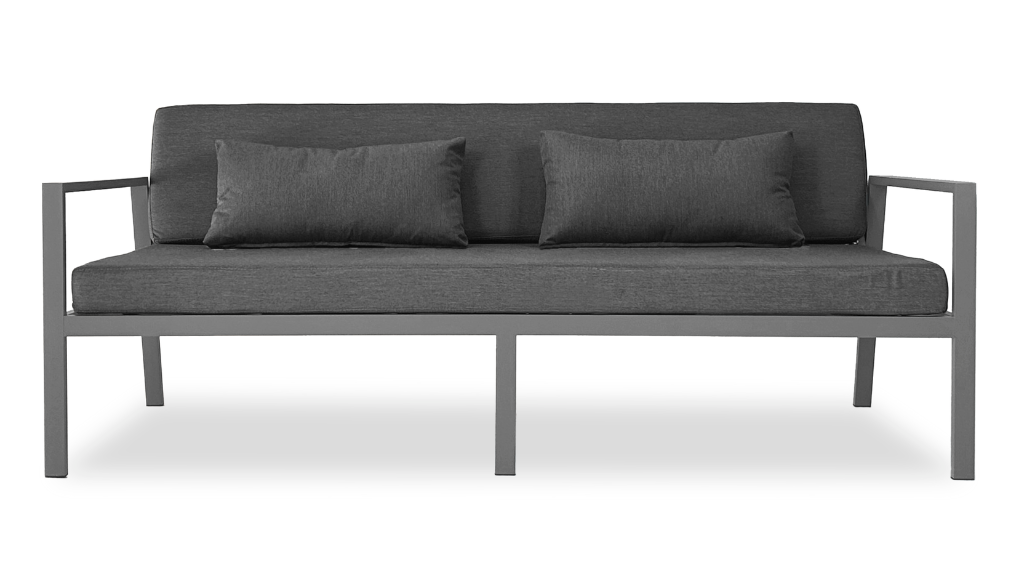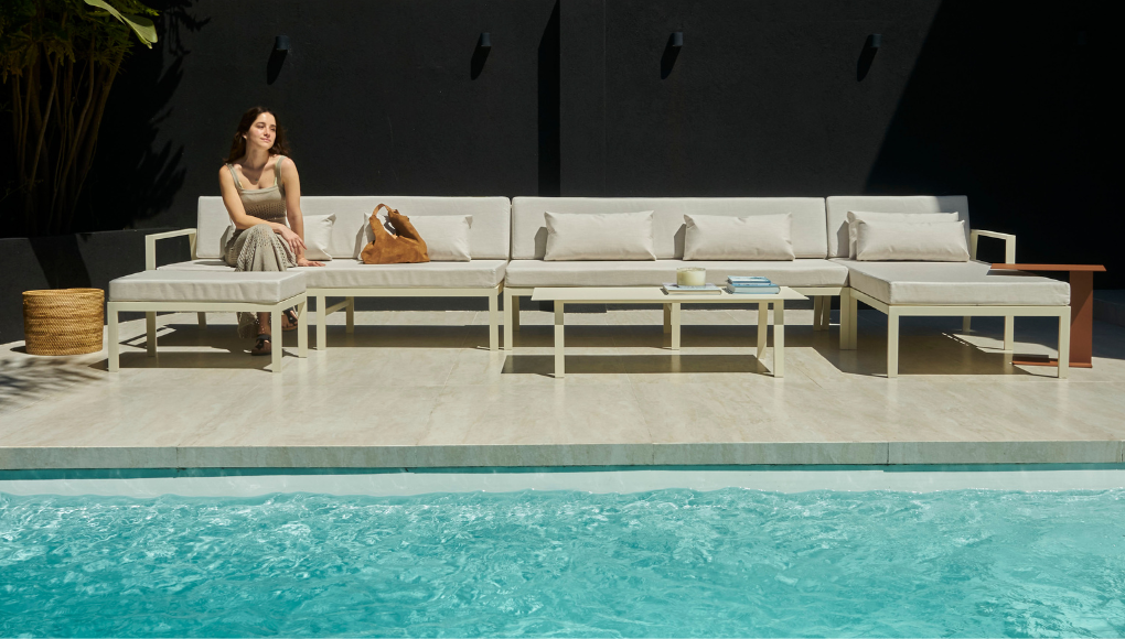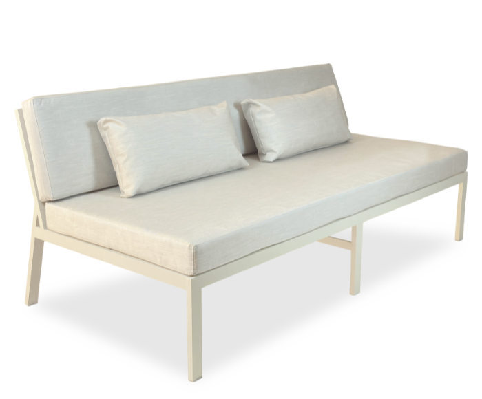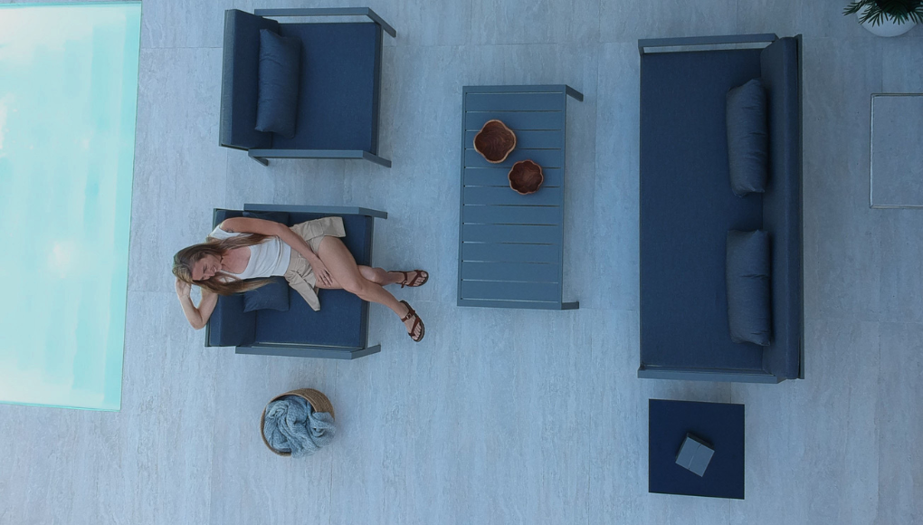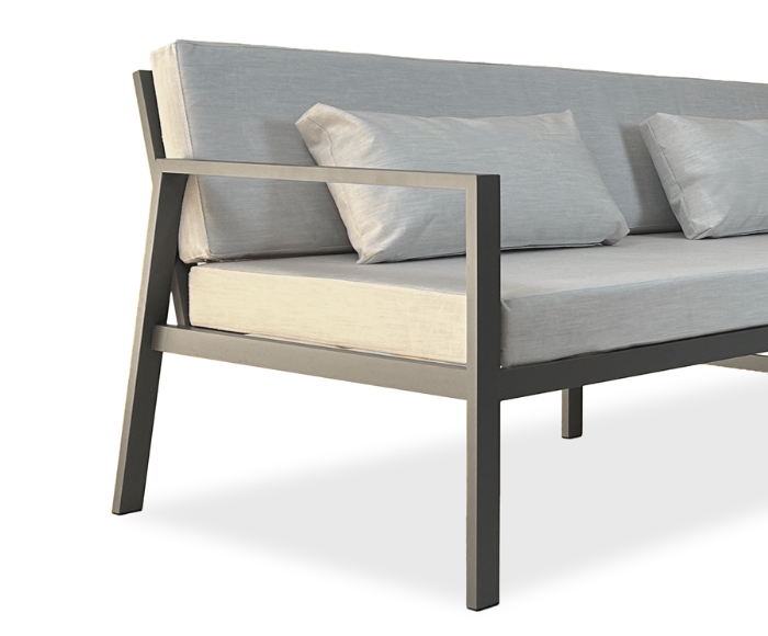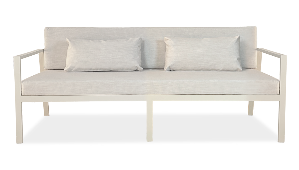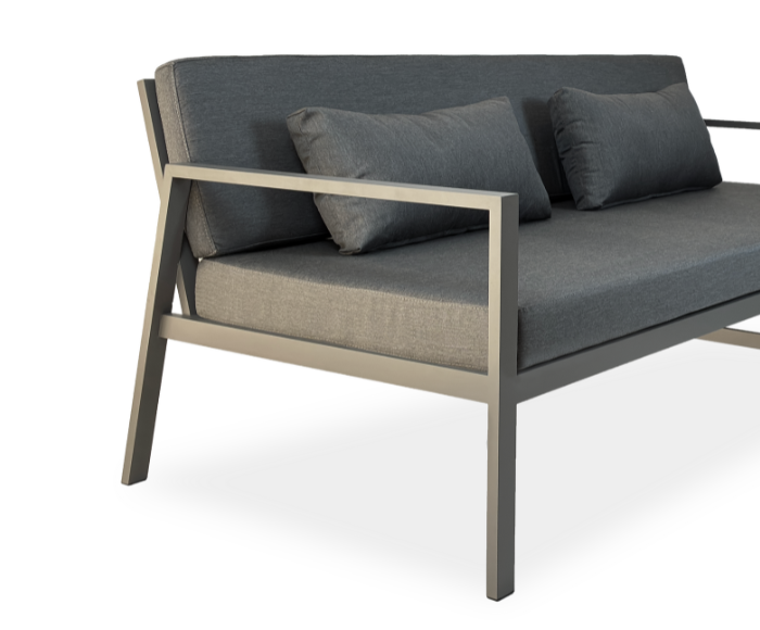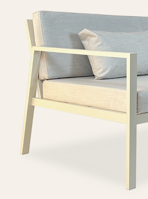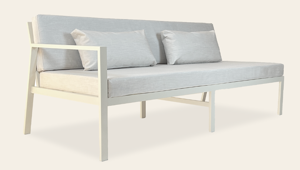 Su estructura de aluminio en perfilería 4 x 2 cm, sólida y ligera, garantiza durabilidad frente a las condiciones del exterior. Sus almohadones brindan comodidad prolongada sin perder elegancia en las líneas.