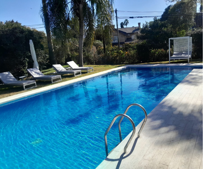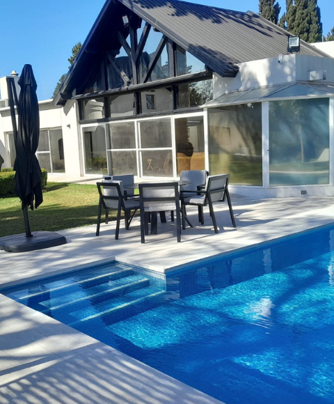 Las reposeras y camastro, con su estructura en aluminio liviano y tapizados pensados para resistir el uso intensivo, enmarcan la piscina con una elegancia relajada. El comedor al aire libre, rodeado de agua y vegetación, invita a compartir almuerzos o largas charlas bajo el sol. La hamaca le otorga al jardín un toque de originalidad y sorpresa.